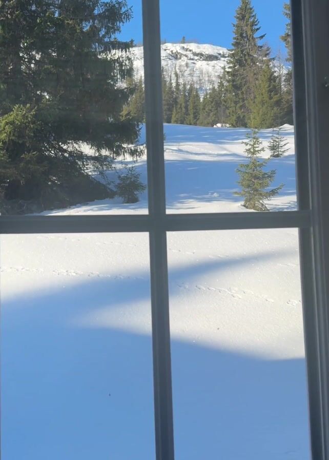 view from inside a building, looking out through a multi-paned window. The scene outside the window depicts a snow-covered landscape with trees and a distant, snowy hill under a clear blue sky. There are shadows cast on the snow. The window has old-fashioned latches. The camera moves slightly during the recording.