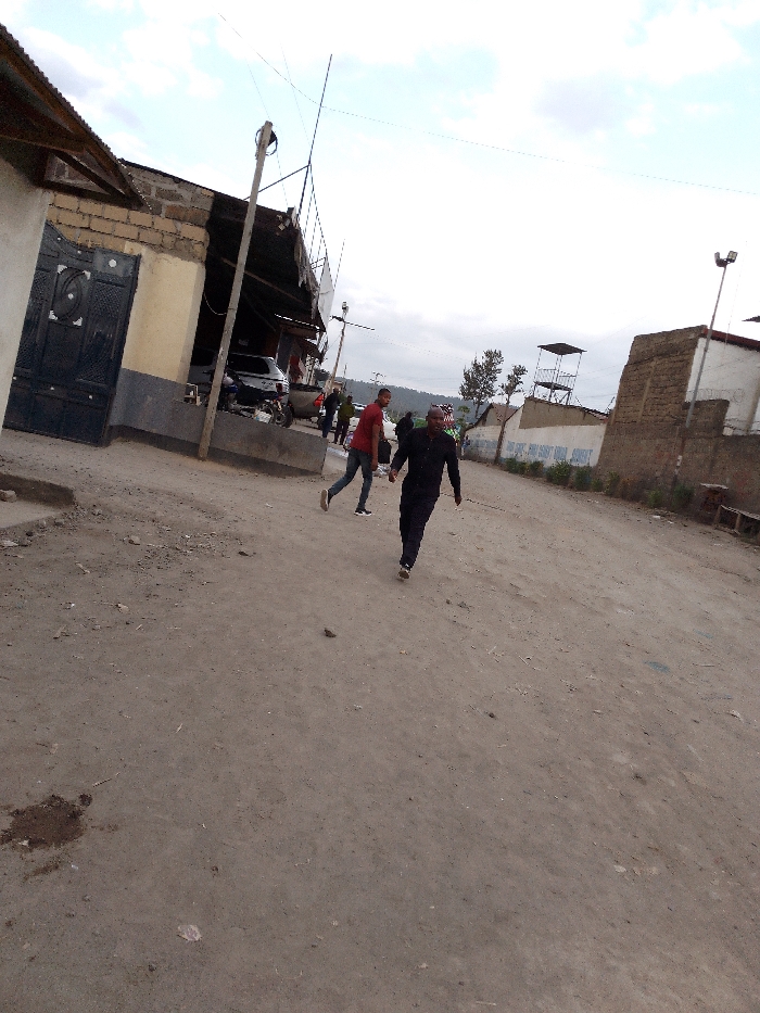 The scene depicts an unpaved, dirt road in the City of London ward, Kenya, under an overcast sky. Two adult males are prominently featured walking along the road towards the viewer. The man in the foreground, positioned slightly right of center, wears a black shirt, dark trousers, and light-colored shoes, with his gaze directed generally forward. Behind him and to his left, a second male wears a red t-shirt, blue jeans, and dark shoes, looking forward as he walks. On the left side of the road, a building with exposed concrete block walls and a dark, ornate double-door is visible. Adjacent to this, a covered structure shelters a light-colored pickup truck or SUV and a motorcycle. A wooden utility pole with overhead wires rises from the left side of the road. Further into the background on the right, an unpainted brick or mud wall, topped with barbed wire, borders the road. A tall pole with a streetlight head stands further along the right side. A metal frame structure, resembling a watchtower, is visible on a distant rooftop. The ground is uneven, comprised of dirt and small stones, with a dark, damp patch visible in the lower left foreground. Indistinct figures are visible near the parked vehicles in the background on the left.