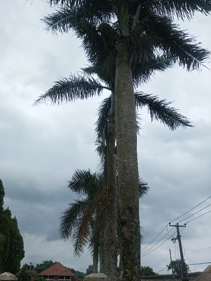 Tall, textured palm trees dominate the frame, their fronds reaching towards a cloudy sky. The gray and white sky hints at an overcast day. Below, a glimpse of a red-roofed building is visible among the trees and plants. Power lines and a utility pole are visible on the right. The scene evokes a sense of nature and urban infrastructure coexisting.