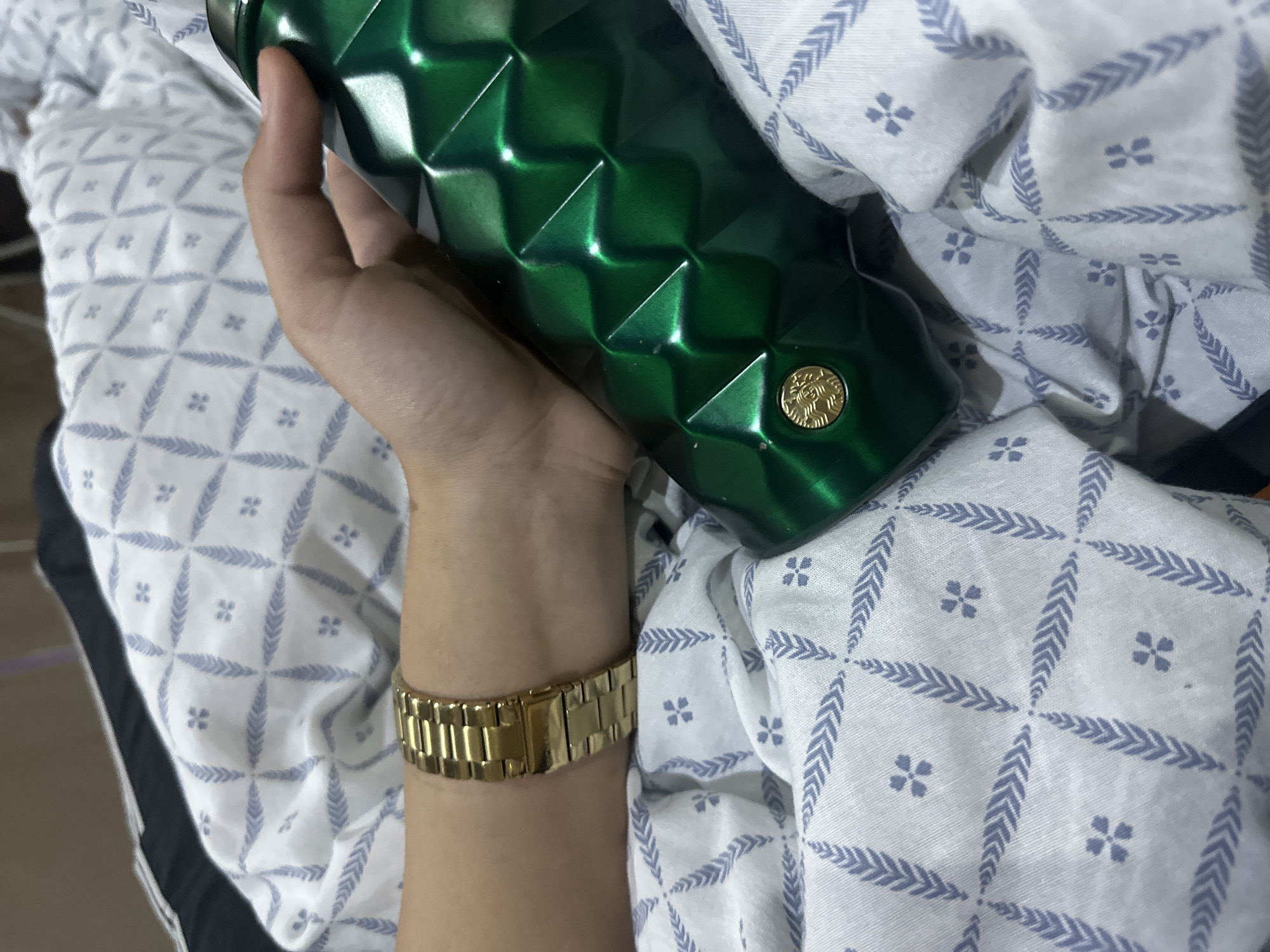The scene is located in Zlatna Panega, Bulgaria. A human left arm and hand are prominently featured, gripping an emerald green, faceted bottle. The arm displays a gold-colored metal wristwatch on its wrist. The bottle exhibits a complex geometric surface pattern composed of numerous pyramidal facets, reflecting light brightly. Near the base of the bottle, a small circular gold-colored emblem with an embossed design is visible. The arm and bottle rest upon crumpled white bedding or fabric, which features a repeating pattern of light blue/grey stylized leaves arranged in a trellis design, with small four-petal flower shapes at the intersections. A dark fabric element is partially visible in the upper left background.