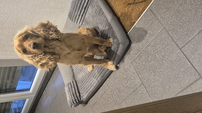- "In an indoor setting in Melle, Belgium, a light-brown Cocker Spaniel dog is positioned centrally, sitting upright on a grey, rectangular dog bed with raised edges and horizontal ridged texturing" by FM-vGj3T2, licensed under CC BY 4.0