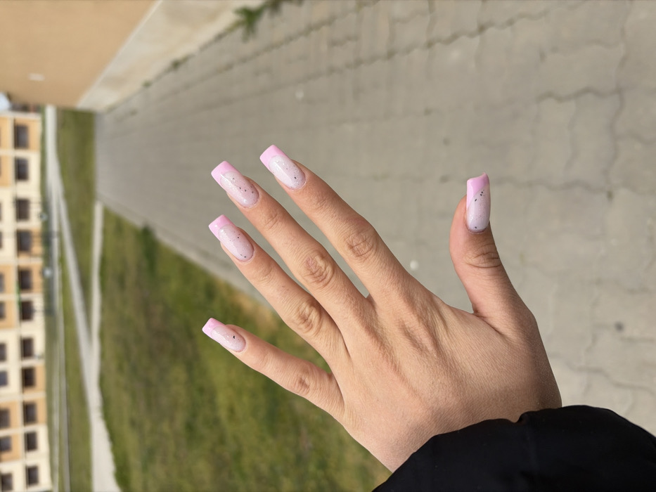 The image presents a close-up, slightly elevated perspective of a human left hand positioned in the foreground against an outdoor urban backdrop. The hand is extended towards the viewer, displaying a light to medium skin tone. Five fingers are visible, gently splayed. Each fingernail features a long, square-tipped artificial extension with a pink "French tip" design overlaying a translucent, light pink base that contains scattered dark, glitter-like particles. A portion of a black long-sleeved garment is visible on the left side of the frame, originating from the subject's arm. The background elements are out of focus. A grey paved pathway, constructed from rectangular blocks, recedes into the distance centrally. Green grassy areas flank both sides of this pathway. In the mid-ground, a multi-story building with a light beige or tan facade and numerous rectangular windows is discernible. To the right, a plain, light tan wall runs parallel to the pathway. The scene is illuminated by bright natural daylight. This environment is situated in Plovdiv, Bulgaria.