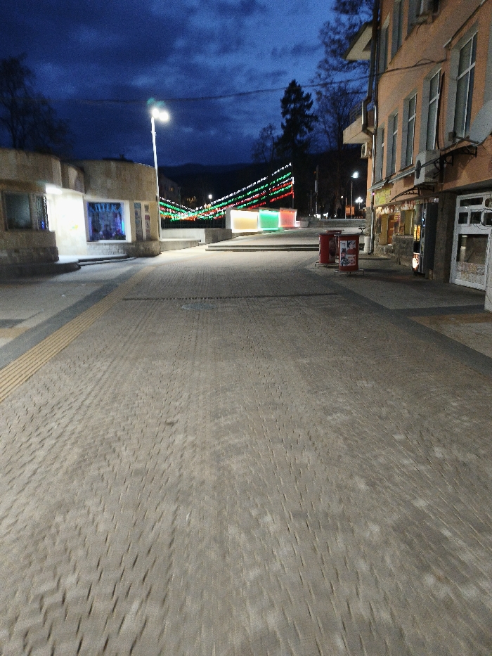 This image depicts an urban pedestrian area at night in Peshtera, Bulgaria