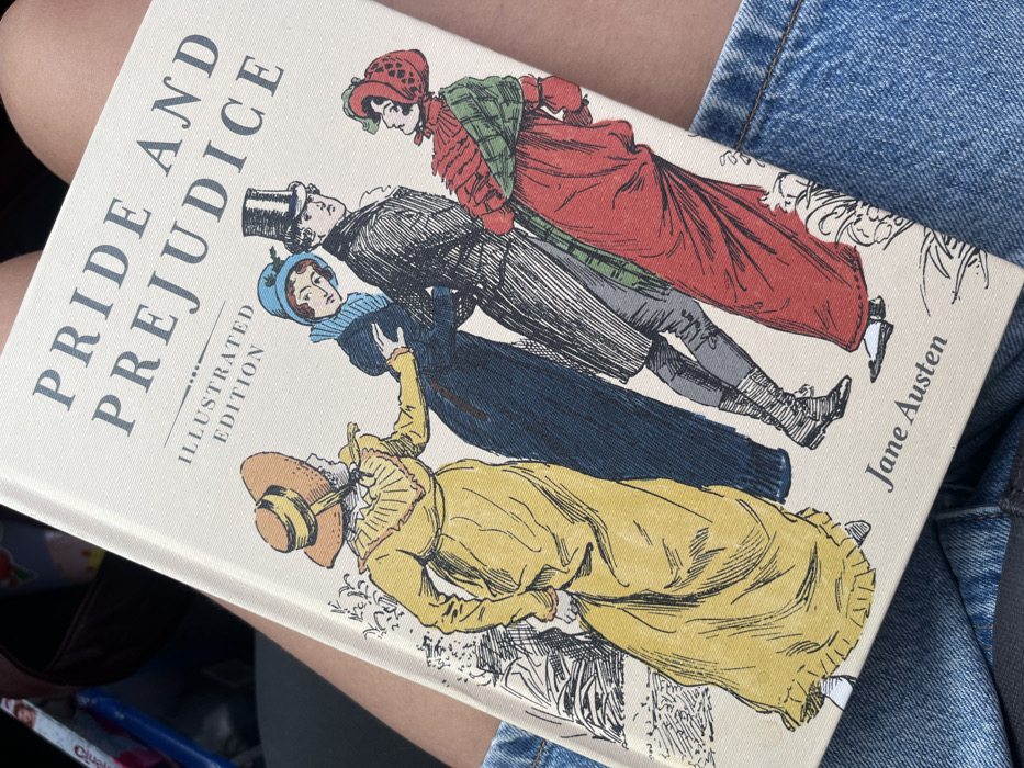 - "The image displays an off-white hardbound copy of "Pride and Prejudice Illustrated Edition" by Jane Austen, held open-faced on the lap of an unidentified individual" by FM-lAJLT2, licensed under CC BY 4.0