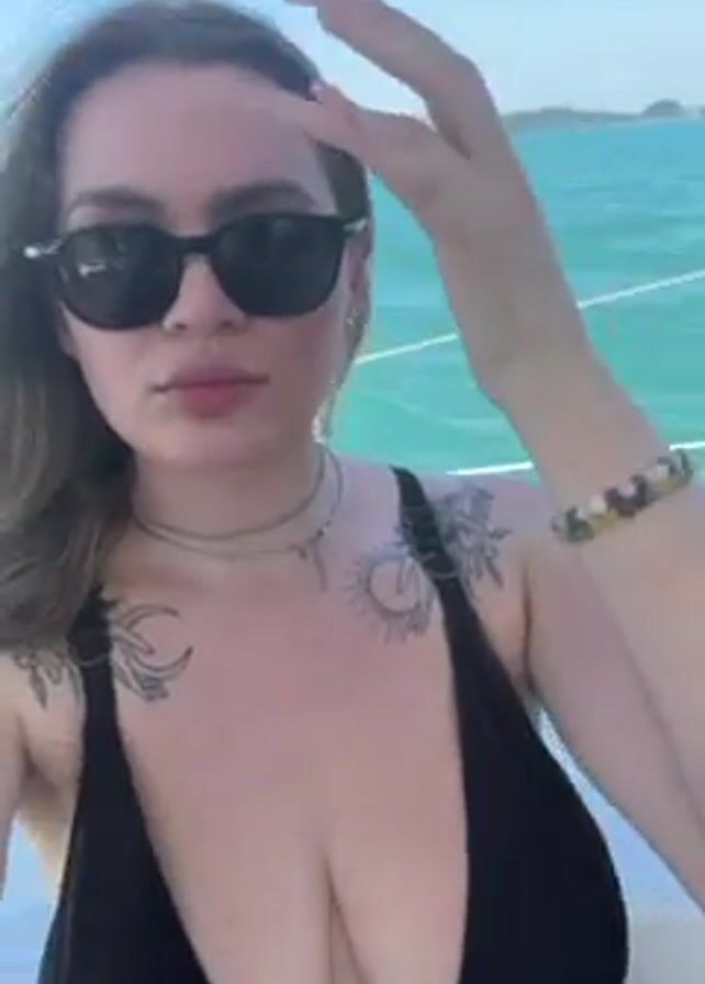 A woman with tattoos, wearing a black swimsuit and sunglasses, takes a selfie on a boat. Another woman, in a red swimsuit and sunglasses, sits behind her. They are surrounded by blue water, with an island in the distance. The woman in black adjusts her hair and poses. Dance music plays.