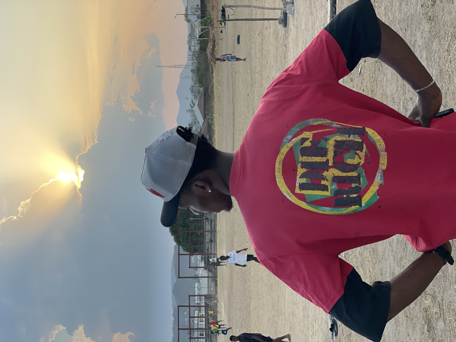 A man wearing a red shirt and a gray baseball cap stands with his back to the viewer. The shirt features a graphic design in a circle with the colors yellow, green, and black. In the background, a group of people appears to be exercising or playing sports on a dusty field. The sky is illuminated by the setting sun, which emits rays of light from behind a cloud. A mountain range is visible in the distance.