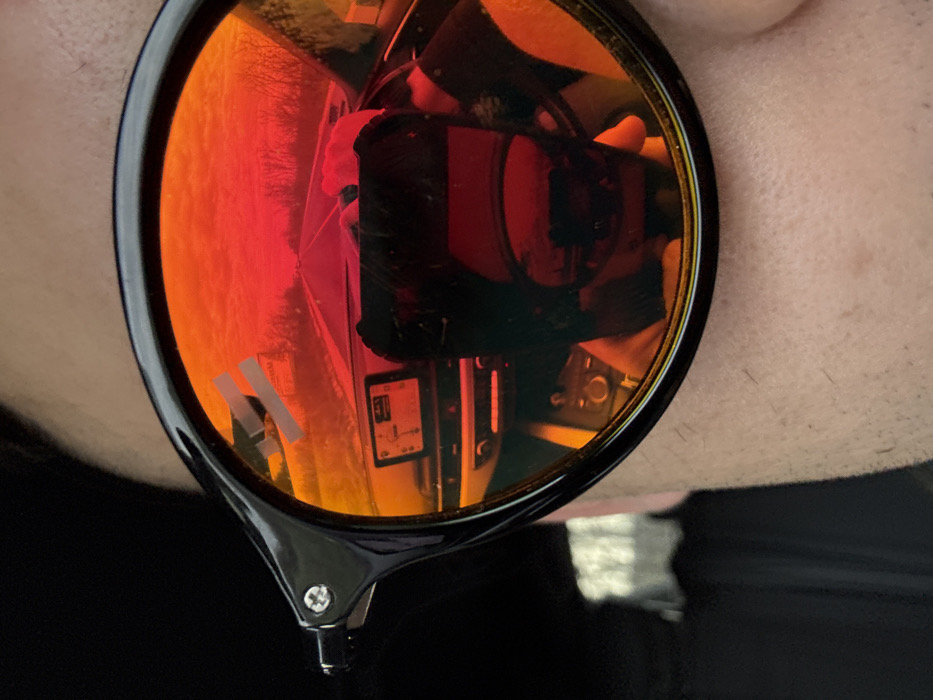 A close-up image captures the right side of an individual's face, primarily focusing on a black-framed sunglass lens with highly reflective, red-orange tinted optics