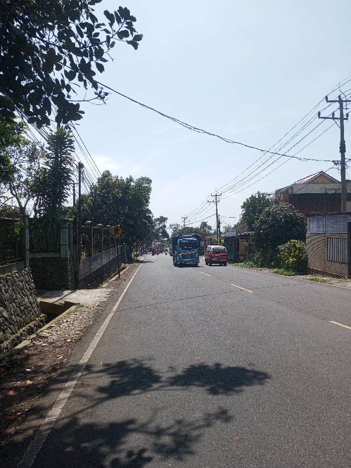 The image presents a daytime view of a two-lane asphalt road in Beteng_Pangkhar_Somthrang, Bhutan, under a clear, bright sky. Strong sunlight casts distinct shadows of overhead foliage onto the road surface. **Environment:** The scene is set on a paved road, appearing dry, with a faded yellow double solid line in the center and a single white line marking the left shoulder. On the left side, a concrete sidewalk is bordered by a multi-tiered stone retaining wall with a small drainage channel at its base. Behind the sidewalk, a decorative fence featuring concrete pillars and metal railings runs alongside a dense line of trees and bushes, including a prominent, tall, slender conifer-like tree. A large tree branch with dark leaves extends into the upper left quadrant of the frame. On the right side of the road, residential buildings with varying facades and a reddish-brown tiled roof are partially visible behind additional trees and shrubbery. Numerous overhead utility lines are strung across the sky, connecting to multiple wooden and concrete utility poles situated on both sides of the road. **Objects and Actions:** A blue truck, possibly a medium-duty flatbed or box truck with distinctive light blue and white paint details, is proceeding towards the viewer in the right lane. Trailing the blue truck in the same lane, further down the road, is a red minivan or small van. In the distance, on the left side of the road, several motorcycles or scooters are present, their riders indistinguishable. No individuals are clearly identifiable or engaged in specific, discernible actions.