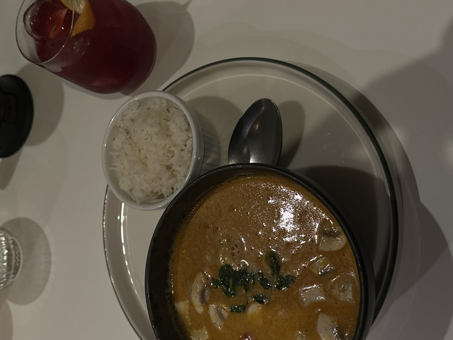 A meal consists of a bowl of soup, likely Tom Kha, with visible mushrooms and herbs, served with a side of white rice in a small, ribbed ramekin. The soup bowl and ramekin sit on a glass plate with a silver spoon. A red beverage in a glass, likely Sangria, sits to the upper left. Black objects are visible to the left. The composition is oriented at an angle, shot from directly above.