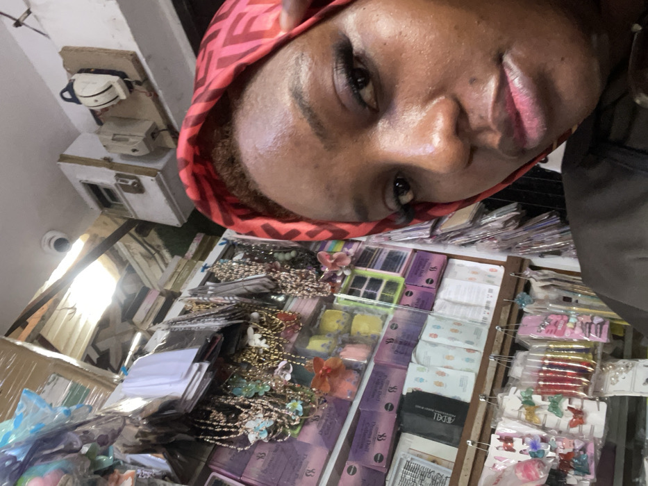 A female subject is depicted in a close-up photograph within a retail shop or market stall in Abuja, Nigeria
