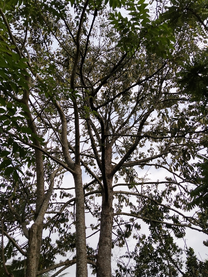 The image displays an upward perspective through the dense canopy of multiple trees in the city of Panton, Indonesia
