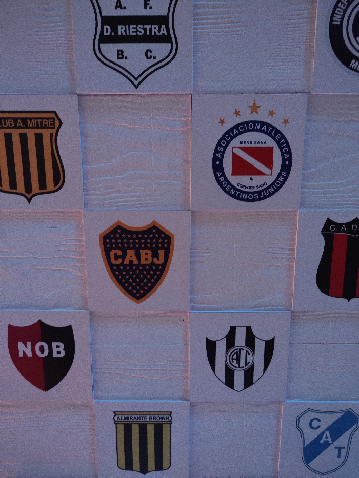 The image displays a collection of soccer team logos arranged in a grid pattern. These logos feature a variety of designs and colors, including shields, stars, and text identifying the teams, such as "Club A. Mitre," "D. Riestra," "Argentinos Juniors," "CABJ," "NOB," "Almirante Brown," and "CAT." The tiles have a textured appearance.