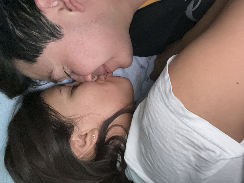 Two individuals are depicted in a close-up, side-profile view, engaged in a kiss