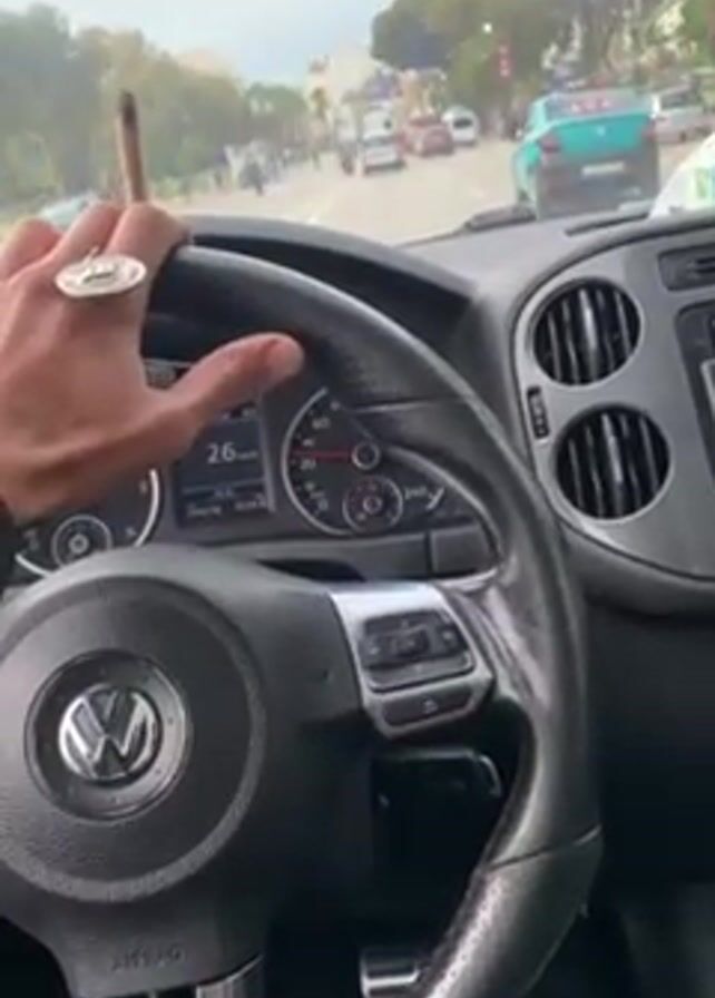 interior of a Volkswagen car from the driver's perspective. The driver's left hand, adorned with a large ring, is gripping the steering wheel. The car is moving, as indicated by the speedometer showing 26 km/h, and is in traffic on a road lined with trees and buildings. In the driver's fingers is what appears to be a rolled cigarette, though its nature is unclear. The car's dashboard is visible, featuring air vents, audio controls, and the Volkswagen logo on the steering wheel. Other cars and pedestrians are visible in the background. The sky is overcast. The overall impression is someone driving a car with music playing, possibly smoking a cigarette or cannabis.