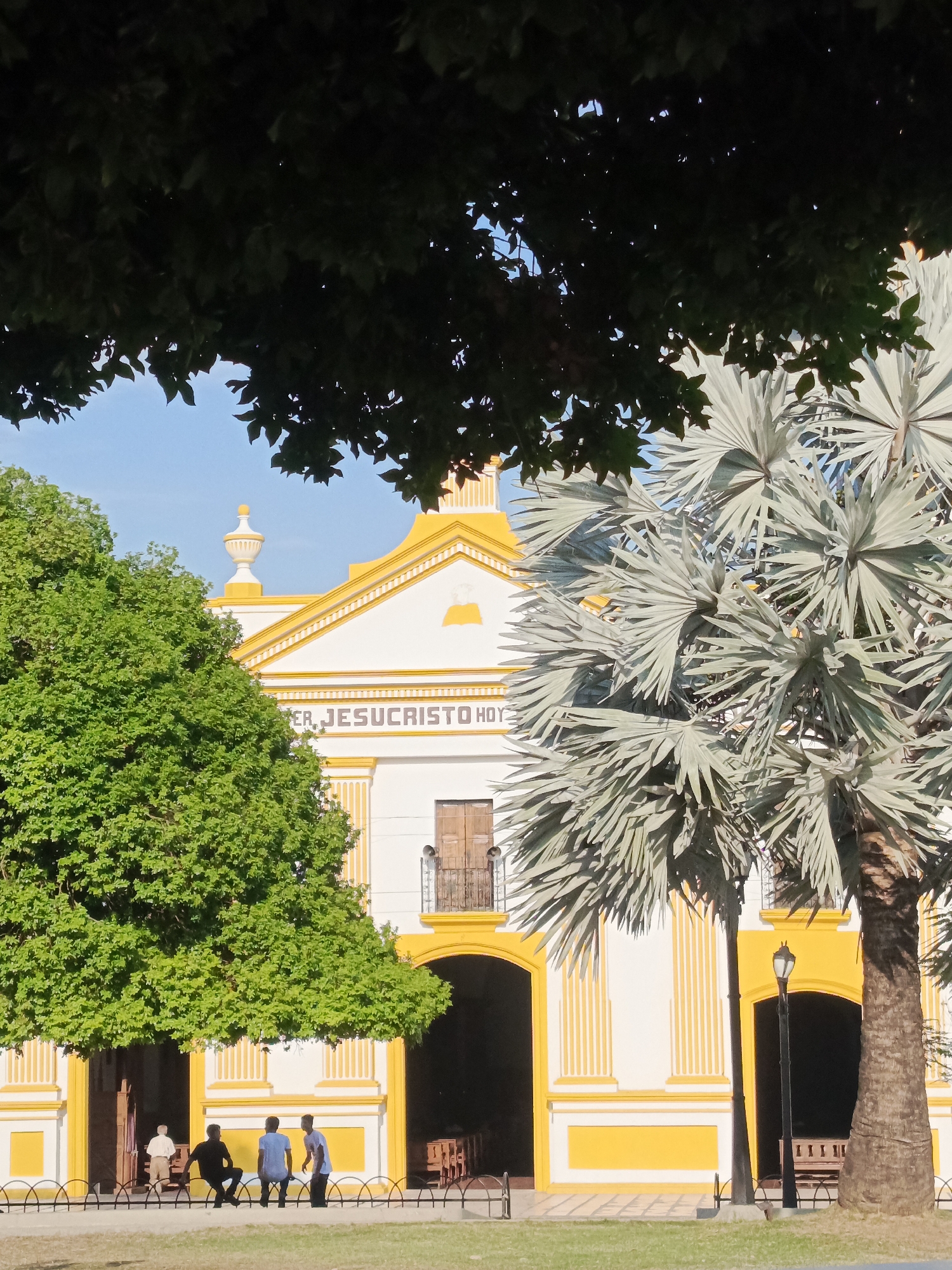 A bright day in the city of Unknown, Unknown. A yellow and white building, possibly a church or religious institution, is partially obscured by trees. The building has a balcony with a dark wooden door. A few people are sitting on a fence in front of the building, and a lamppost is visible to the right. A large palm tree with silvery-green leaves stands on the right side of the frame. The sky is a clear, light blue.