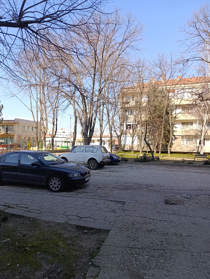 This image depicts an outdoor urban environment in Silistra, Bulgaria, under a clear blue sky, indicative of winter or early spring. The foreground features a degraded concrete pathway composed of hexagonal pavers, showing extensive cracks, alongside areas of exposed soil and sparse moss/vegetation. In the midground, a dark-colored sedan, identifiable as a Volvo S60, is parked facing right on an uneven, cracked asphalt or concrete surface. Immediately behind it, a white Lada Niva SUV is parked, also facing right, exhibiting rust on its rear quarter panel. A third, dark blue vehicle is partially visible behind the white SUV. The background is dominated by numerous tall, bare-branched deciduous trees. Beyond the trees, multiple multi-story buildings are visible, including a lighter-colored structure on the left and a prominent yellow-ochre building with a reddish-orange tiled roof and white-framed windows on the right. No individuals are present in the scene.