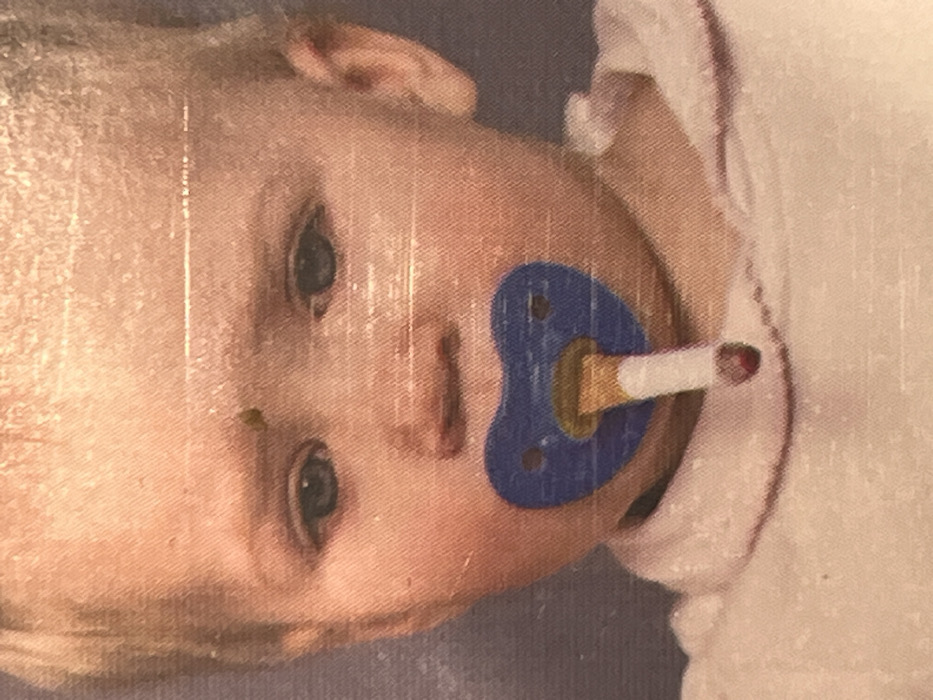 An image of a baby with a pacifier in its mouth. The pacifier is blue with a yellow center. In place of the typical plastic or silicone part of the pacifier that a baby would suck on, there is a lit cigarette. The baby has fair skin, light hair, and light-colored eyes. They are wearing white clothing. The image has some discoloration and vertical lines, suggesting it may be an older or damaged photograph.