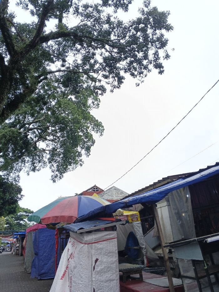 The scene depicts a street or market area in Ho Chi Minh City, Vietnam, under an overcast sky. A large, densely leafed tree with thick, gnarled branches, possibly covered in moss, dominates the upper left. A single utility wire runs diagonally across the upper right quadrant of the sky. Along the right side of a paved path, a row of makeshift market stalls or small shops is visible. These structures are constructed from various materials, including blue, white, red, and green tarpaulins, corrugated metal roofing, and wooden supports. A prominent multi-colored umbrella or canopy, with red, blue, and green sections, is visible in the mid-left foreground. Several stalls are enclosed with white woven tarpaulins, one of which displays partial text in a foreign language, including the visible words 'PRODUK DOMBA' and 'PONDOK'. A small, dark wooden stool or table rests in front of one such white-covered stall. In the far left background, additional stalls and what appear to be parked motorbikes or scooters are faintly discernible. No individuals are clearly visible in the immediate foreground or mid-ground.