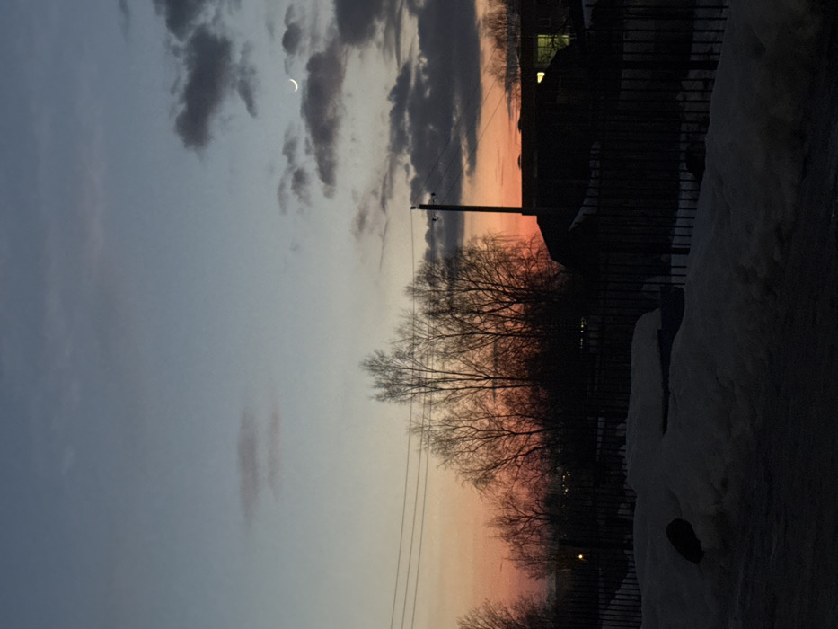 The image displays an outdoor scene at dusk or dawn in Dmitrov, Russia, during a cold season with snow present on the ground. The sky transitions horizontally from an intense orange and red glow at the lower horizon, indicative of the sun's position, through lighter orange and pale blue, to a darker blue-grey overhead. A waxing crescent moon is visible in the upper right quadrant of the sky, positioned among scattered dark grey clouds. Multiple parallel power lines stretch horizontally across the upper mid-ground, silhouetted against the gradient sky. A prominent dark utility pole stands vertically on the right side, extending from below the horizon line upwards into the darker sky. Below the power lines, a dense cluster of bare deciduous trees, devoid of leaves, forms a dark silhouette against the vibrant orange-red sky in the mid-ground. To the right of the trees and utility pole, dark silhouettes of several low-lying buildings are visible, with one building exhibiting a faint yellow light emanating from an interior window or opening. In the foreground, the ground is covered with irregular patches of dirty snow and darker exposed earth or debris. A dark, vertical-slat fence runs horizontally across the lower third of the frame, partially obscured by the snowdrifts. No human figures or animals are present in the scene.