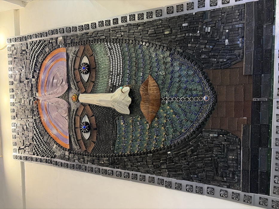 A large, vertical, rectangular mosaic artwork, titled "The Face of the Future" by artist Rakesh Kumar, is mounted on a plain, light-colored wall
