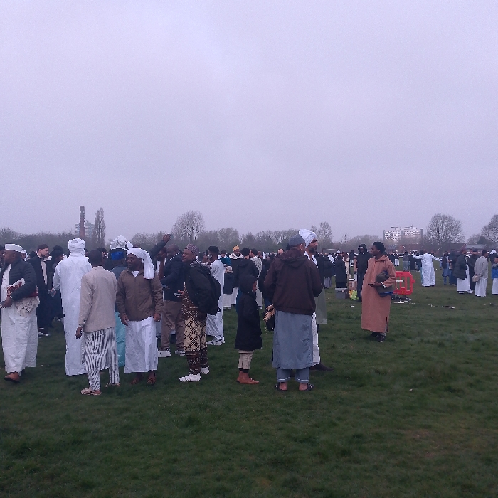 This image captures a large outdoor gathering of approximately 70-100 adult males on a green grassy field under a uniformly overcast grey sky. The scene is located in Edgwick Park, Foleshill, Coventry, United Kingdom, with the distinctive twin industrial chimneys of the former Foleshill Power Station visible on the left horizon and distant residential buildings on the right horizon. The individuals are dispersed across the field, standing in small groups or individually. Their attire is a mix of traditional Islamic garments, including white thobes, long tunics, and various head coverings (such as taqiyah, kufi, or turbans), alongside Western clothing like jackets, trousers, and hoodies. No specific active actions or direct interactions like prayer or formal assembly are clearly observable; individuals appear to be conversing or waiting. One man on the far right holds a brown object, possibly a prayer mat or bag, while another individual in the mid-ground holds a red, collapsible-looking object. The ground consists of short, green grass, indicating an open park area, with sparse, mostly bare trees lining the distant background.