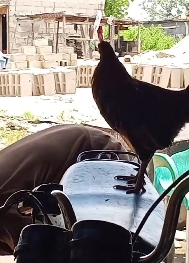 A medium shot of a dark-colored rooster standing atop the seat of a dark-colored motorcycle, crowing. The motorcycle's handlebars are visible in the lower foreground. Behind the motorcycle is a man, mostly obscured by a brown blanket or cloth. In the background, there are stacks of rectangular gray objects, possibly cinder blocks, and a partially constructed structure. The environment seems to be an outdoor, possibly semi-industrial, setting. A green plastic chair is also visible behind the motorcycle.