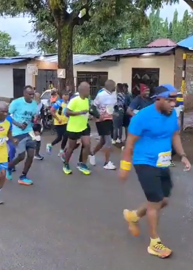 A group of about 20 people, mostly men, are running down a paved road in what appears to be a race. They are wearing athletic clothing and race bibs. Several are wearing yellow and blue jerseys. Some wear shorts, while others wear long leggings. The road is lined with trees and small buildings. Several yellow vans are parked on the side of the road. A motorcycle with two people on it follows the runners. People are shouting encouragement to the runners in an unidentified language. It appears to be overcast.