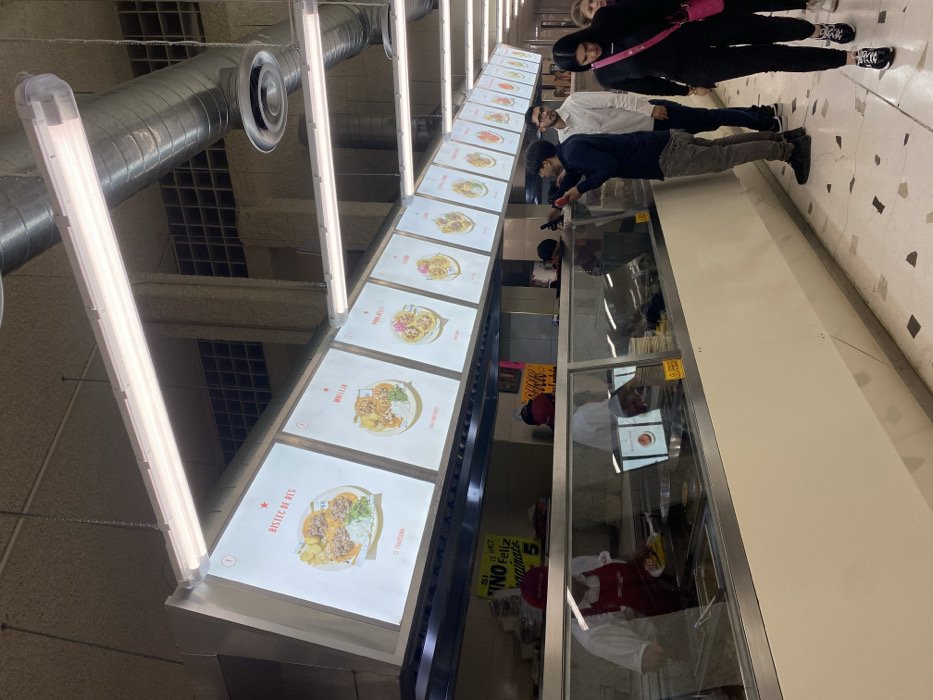 Fluorescent lights illuminate a restaurant's menu board displaying food options. Customers line up to order. The menu showcases dishes with vibrant visuals, including bistec de res. Servers are visible behind a glass partition. Signage with Spanish text is present, possibly advertising promotions. The environment suggests a bustling fast-casual dining experience.
