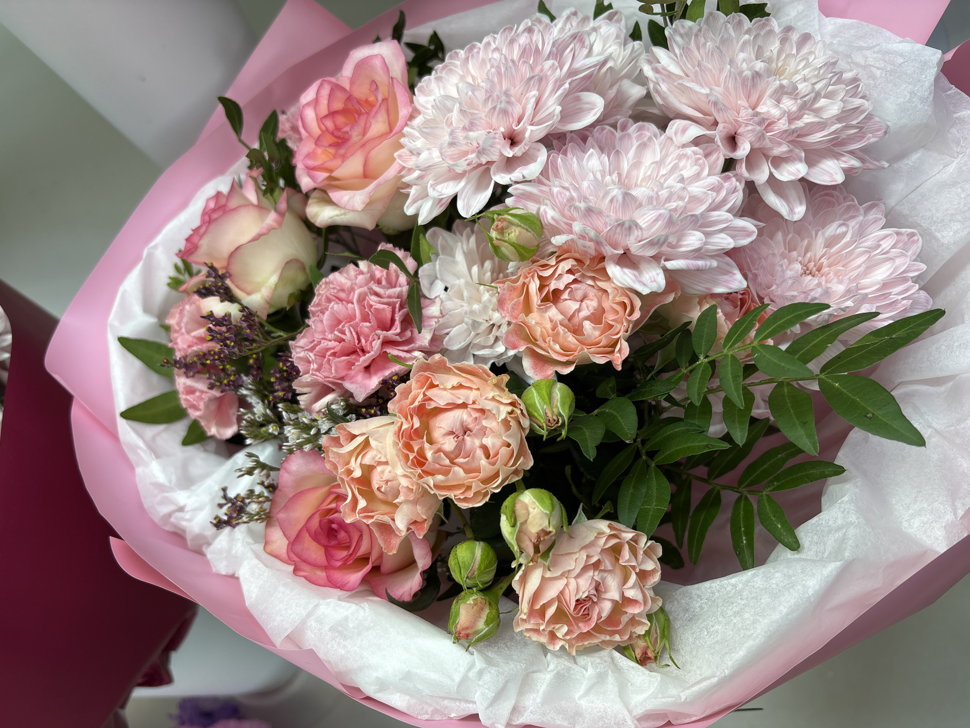 bouquet of flowers wrapped in pink paper and white tissue. The bouquet contains a variety of pink and peach-colored flowers, including roses, chrysanthemums, and carnations. The flowers are arranged with green leaves and small purple filler flowers. The background is out of focus and shows hints of white and burgundy colors. The location is not discernible from the image.