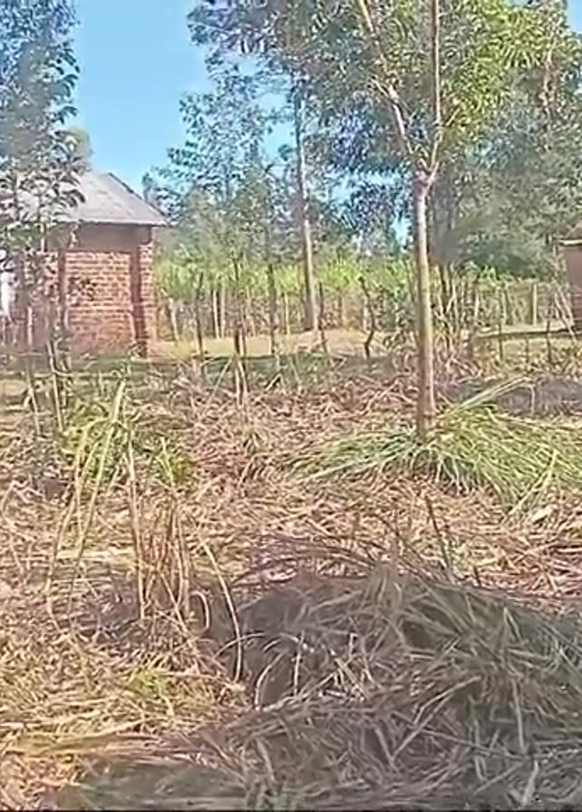 n outdoor scene with a group of people loading dry vegetation onto a tractor-pulled trailer. The land is covered with dry grass and vegetation, interspersed with small trees and plants. In the background, there are several small brick buildings with corrugated metal roofs. A blue tractor is parked nearby, attached to a trailer piled high with the gathered vegetation. The people are dressed in casual clothing and appear to be working together to load the material onto the trailer. The sky is clear and blue, suggesting it is a sunny day. The camera pans across the scene, providing a wider view of the surroundings.