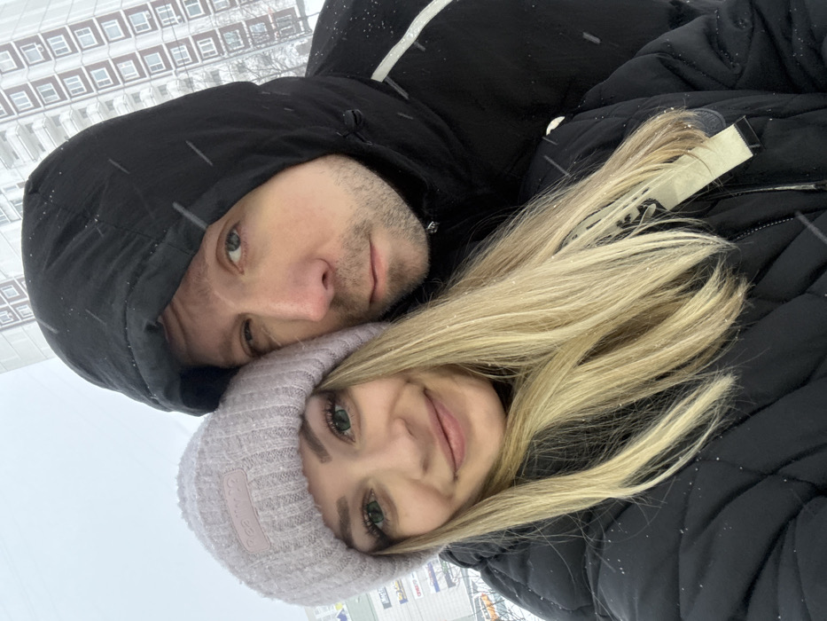 A close-up outdoor photograph captured during snowfall in Reutov, Russia, features two individuals