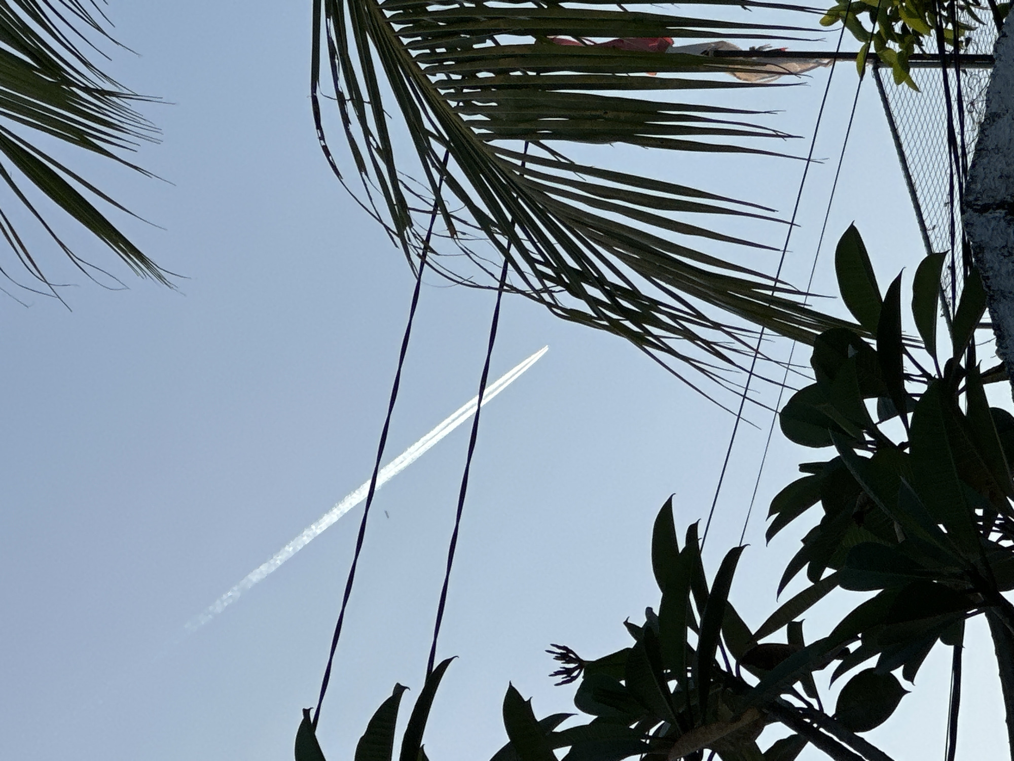 The image, likely taken in Dalung, Indonesia, depicts a sky view framed by foliage. Dominating the scene are palm fronds at the top left and top center, casting shadows and defining the upper boundary. To the right, large, dark green leaves of a different plant species are visible, adding contrast in shape and color. A white contrail, caused by a high-altitude aircraft, slices diagonally across the pale blue sky. Thin, dark lines, possibly cables or ropes, intersect the view between the sky and the foliage, adding depth to the composition. Part of a fence can be seen close to a vertical trunk.
