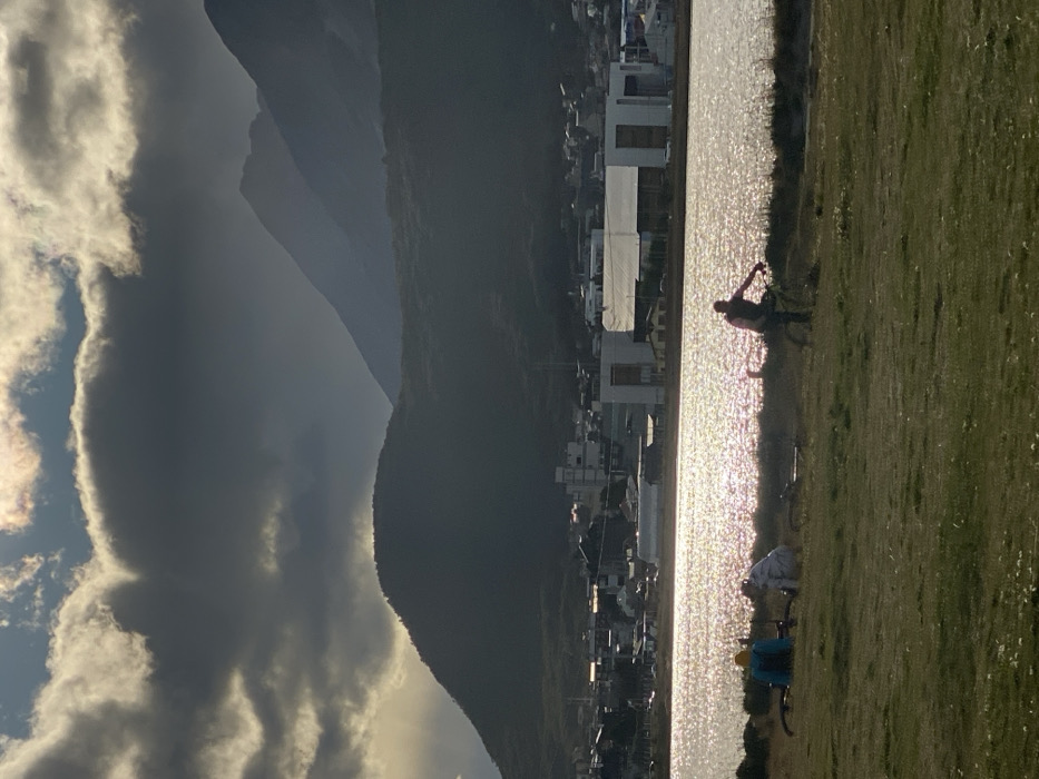 A shimmering body of water reflects sunlight next to a grassy area where three figures with bikes are present. Beyond the water, buildings line the edge, nestled against a large, dark mountain. To the left of the mountain, the sky is filled with dramatic, dark clouds, creating a striking contrast with the bright water and green grass.