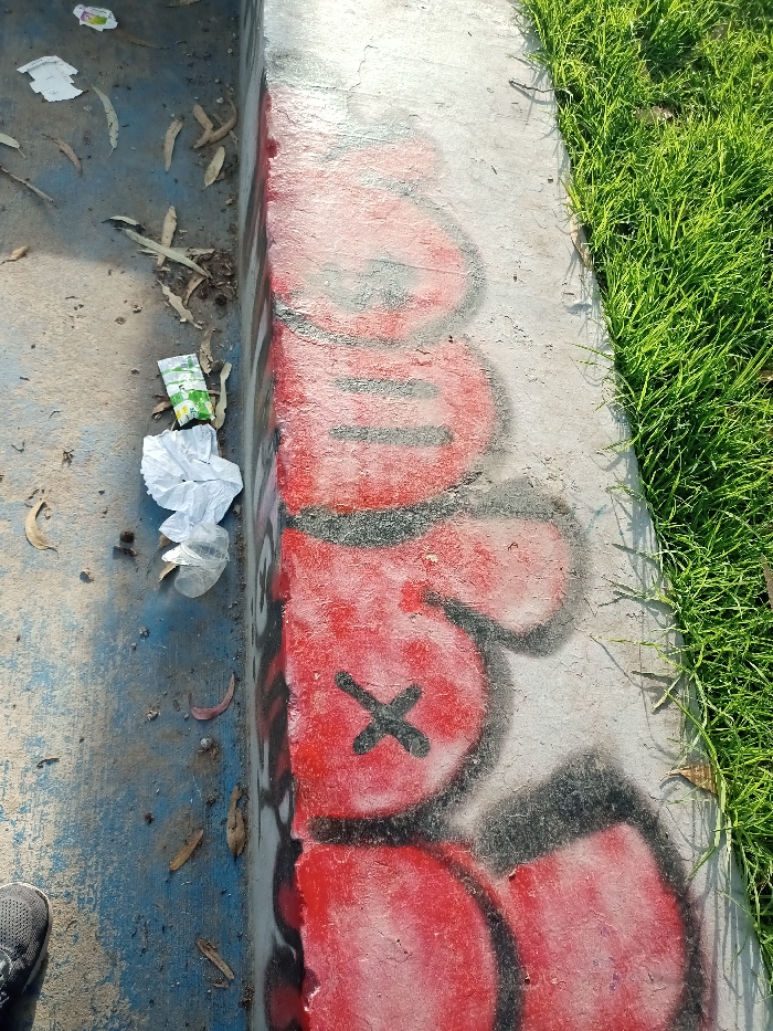 A concrete curb divides blue pavement with litter from green grass. Red and gray graffiti of cartoon faces adorns the curb's side. One face displays an "X" for an eye. Leaves, a juice box, and crumpled paper lie scattered on the pavement. A shoe is visible at the bottom left corner. The scene is captured outdoors in daylight.