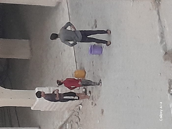 three individuals standing on a light-colored, dusty ground in Khan Yunis, Palestinian Territory. On the left, a young male, possibly a teenager, in a dark short-sleeved shirt with white stripes and dark shorts, stands facing right, with arms slightly bent. Central to the frame, a younger individual in a red long-sleeved shirt and grey trousers stands with hands behind their back, facing right. To the right, an adult male, viewed from behind, wears a grey striped long-sleeved shirt and dark trousers, with hands on his hips. A yellow jerrycan rests on the ground between the first two individuals, and a purple bucket is positioned between the second and third individuals. The background features light-colored architectural elements, including a column base with an arched opening on the left, and indistinct light-toned walls further back, suggesting an outdoor or semi-enclosed space.