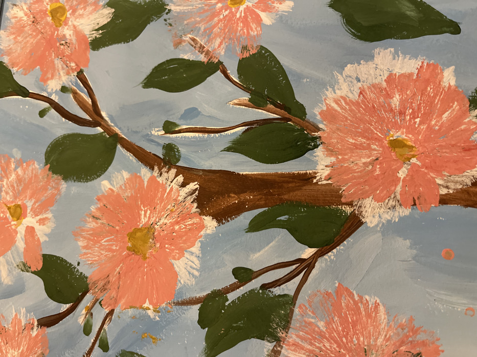 An image depicts a painting of pink flowers with yellow centers, clustered around brown branches with dark green leaves, set against a light blue sky