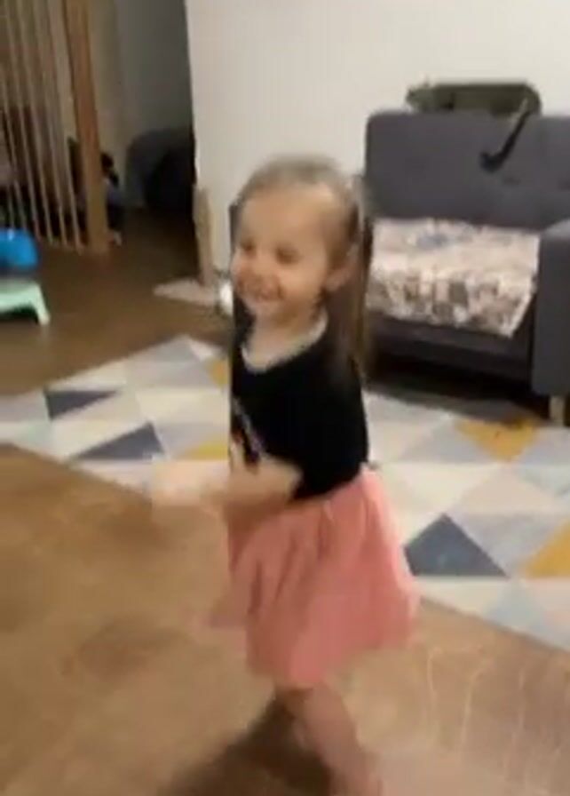 A little girl is dancing in a living room