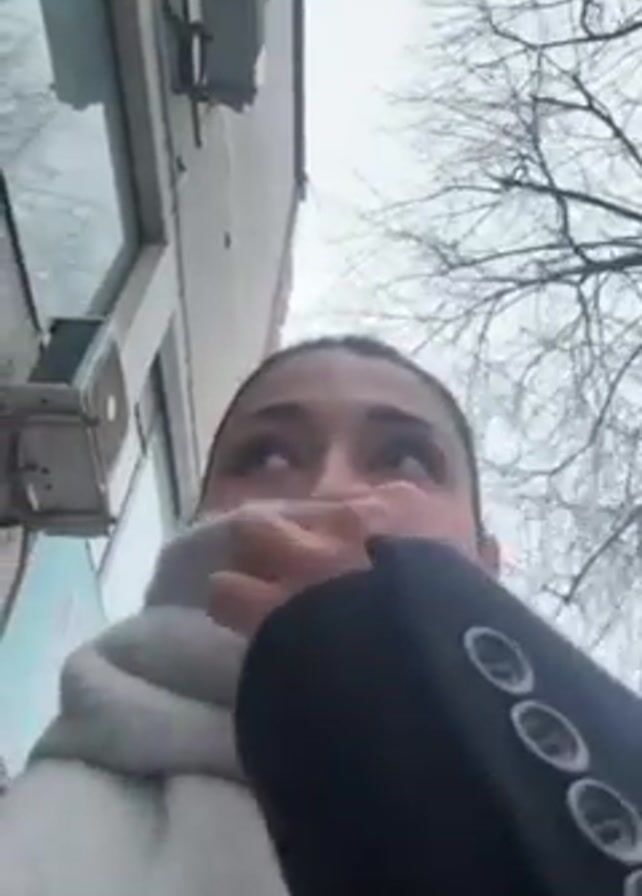 A woman is outside on what appears to be a cold day. She is wearing a light-colored scarf that is covering most of her face. She also has on a dark-colored coat or jacket. The camera angle is low, suggesting the video is being taken at close range, likely from a phone. The woman is looking up and ahead. Behind her, there is a building with multiple air conditioning units attached to the exterior. The sky is overcast, and there are bare tree branches visible in the background, suggesting it might be winter. She adjusts her scarf with her hand.