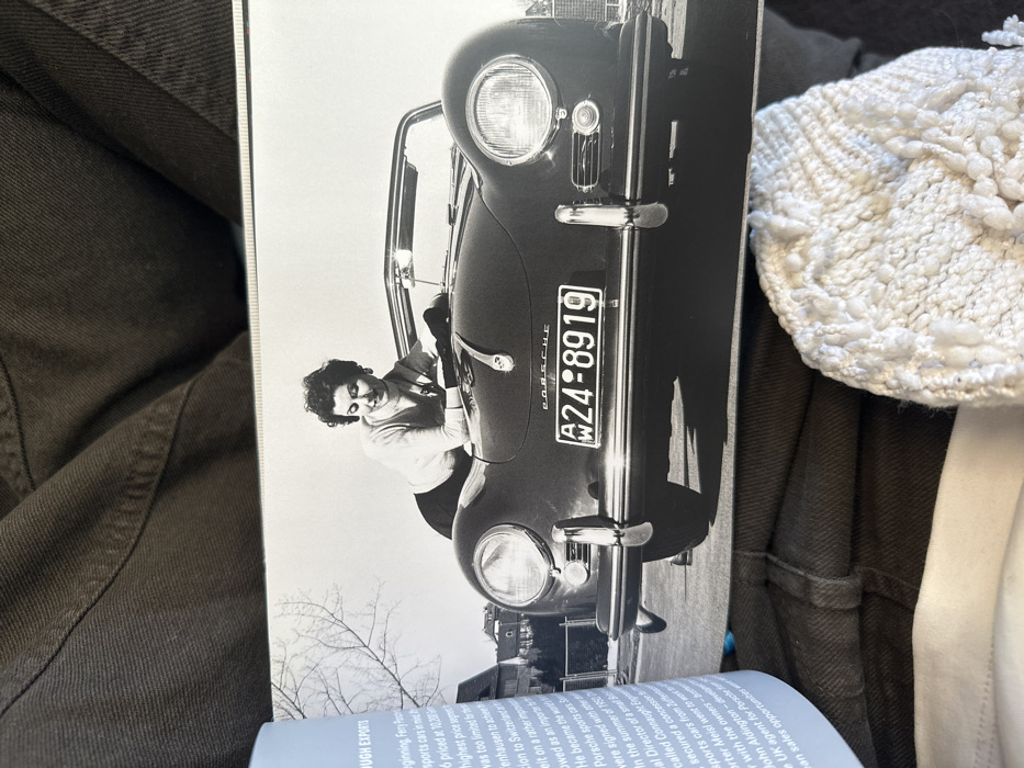 A black-and-white photograph shows a woman beside a classic Porsche. The car's license plate reads "A24-8919". The photo is printed in a book, with text about "rough exports" visible at the bottom, mentioning "sports cars priced at 10200." The text also discusses Swiss and UK agents and sales opportunities related to Porsche sports cars. The book is surrounded by textured fabrics in white and olive green, suggesting it's resting on clothing or a soft surface.