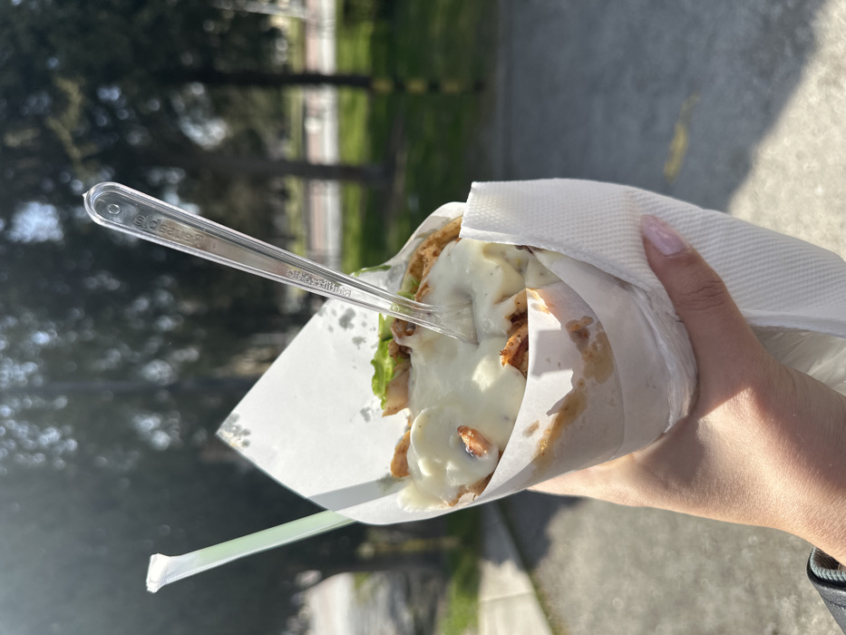 A human hand, appearing to be female with light pink nail polish, holds a conical food item wrapped in white paper and a white paper napkin. The food consists of cut meat pieces, creamy white sauce, and green leafy vegetables, indicative of a gyros or similar wrap. A clear plastic fork, embossed with the name "Godzila," is inserted into the food. A light green plastic straw protrudes from the upper left of the wrap. The background is an out-of-focus outdoor environment featuring green grass, trees with developing foliage, and a light-colored paved pathway under direct sunlight, casting shadows on the dark grey ground surface in the foreground. This scene is located within the city of Varna, Bulgaria.