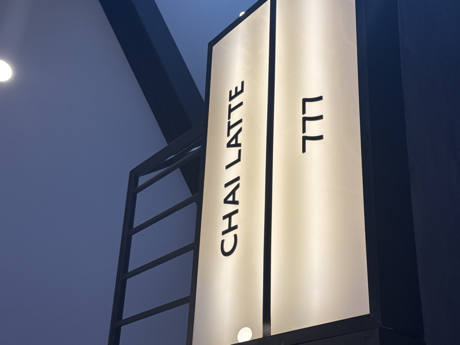 A vertical, illuminated sign displays "CHAI LATTE" and "LLL" in bold, black, sans-serif font, stacked vertically on a pale surface