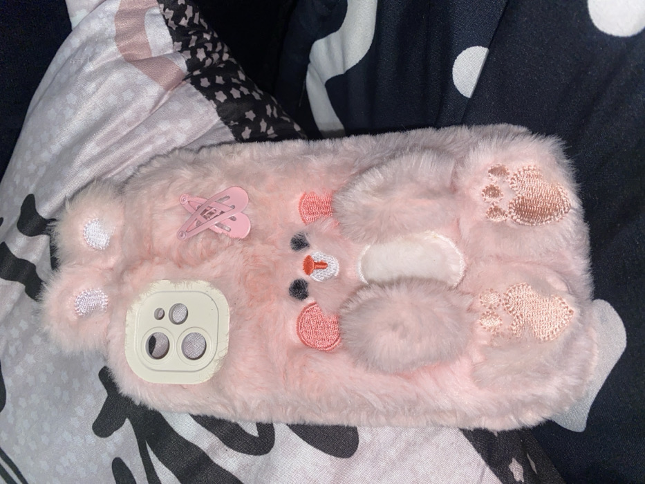- "A pink, furry phone case resembling a bear lies on a patterned surface" by FM-qjcgj2, licensed under CC BY 4.0