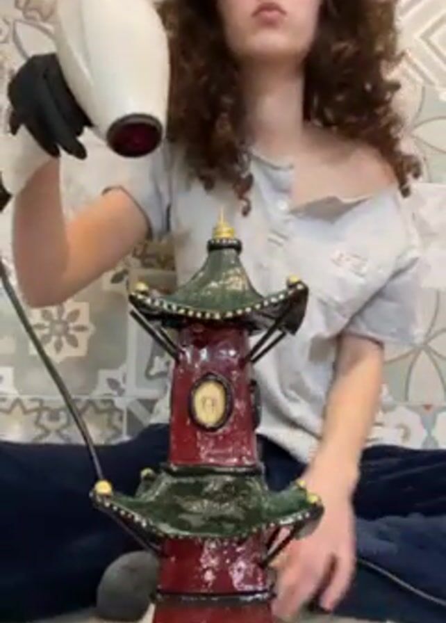 A woman with curly hair sits cross-legged in front of a tiled wall. She wears a gray t-shirt and dark pants. She is using a white hair dryer to dry a small, decorative pagoda. She wears a black glove on the hand holding the hairdryer. The pagoda is red with green tiers, and golden accents. The woman looks directly at the pagoda while using the hairdryer. The tiles on the wall have an intricate pattern. A cable and the hairdryer power cord are visible on the floor.