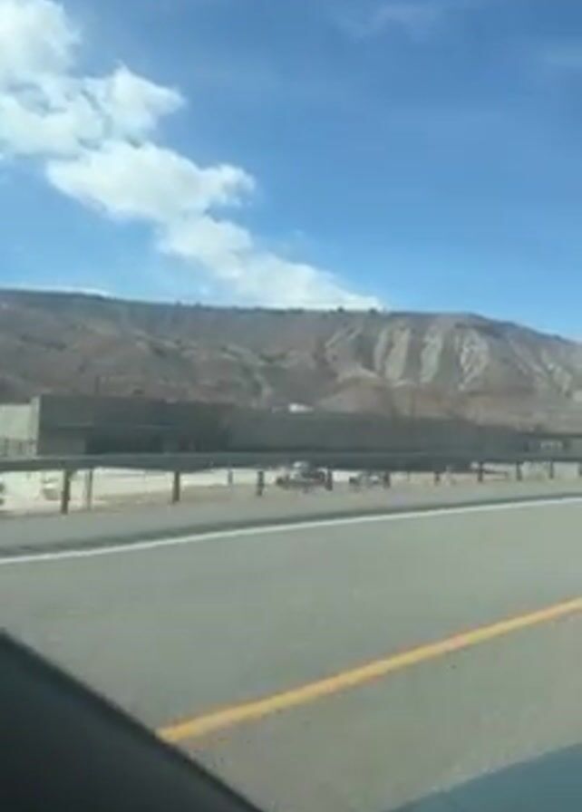 view from inside a car moving on a highway. The sky is blue with some white clouds. On the right side of the road, there is a gray, almost barren hill or mountain range in the distance. Along the road there is a gray concrete barrier. Two flags are visible.