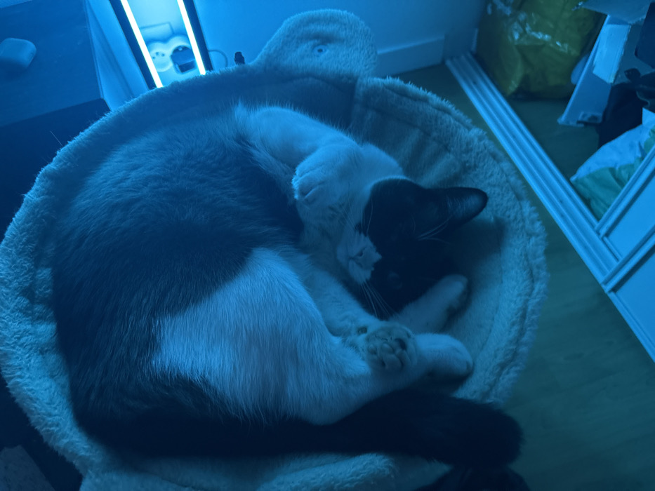 A black and white cat is curled up asleep in a soft, round cat bed. The cat’s body is mostly curled to the left with its head resting on its paws. The cat's tail is also curled around its body. The lighting is blue and dim, giving the image a surreal feel. The background is slightly blurred, showing glimpses of a desk and other furniture.