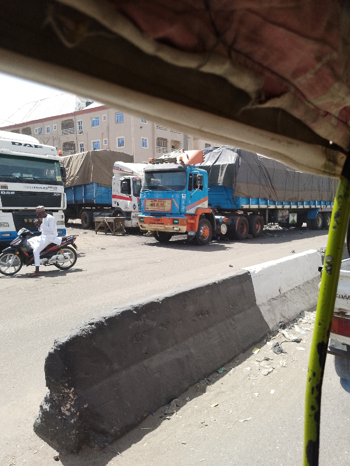 A daytime street scene in Sabon Gari West, Nigeria, features a man on a motorcycle on an asphalt road foregrounding several large cargo trucks