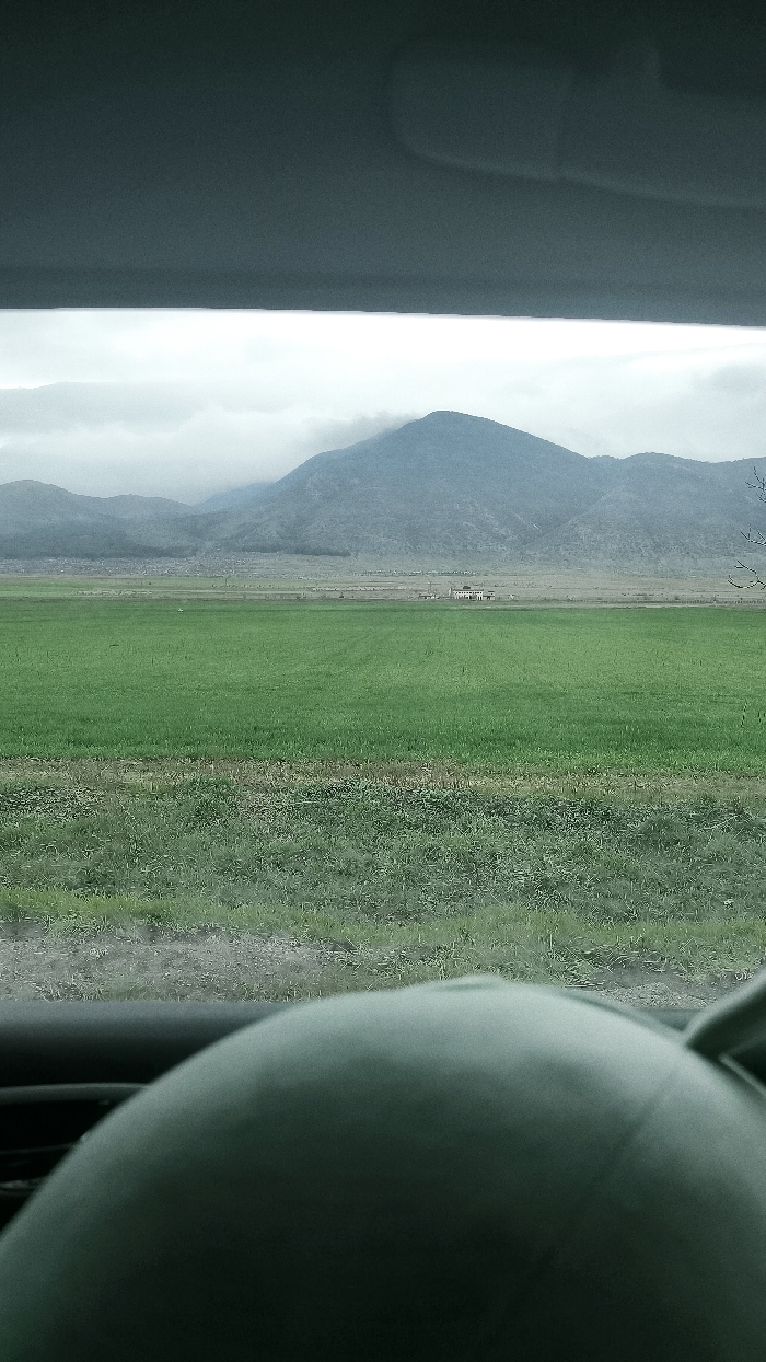 The image presents a rural landscape viewed from within a vehicle, located in the vicinity of Topolchane, Bulgaria. The upper third of the frame shows the dark grey interior roof lining and sun visor of the vehicle. The lower foreground is occupied by the dark grey, curved surface of a vehicle's dashboard or steering wheel. Through the windshield, a broad, flat expanse of vibrant green agricultural field dominates the midground. A strip of lighter green and brown vegetation, consistent with an uncultivated roadside, separates the immediate foreground from the main field. In the far midground, beyond the green field, a lighter brown plain extends towards the base of distant terrain. Several light-colored buildings are visible on this plain, and a cluster of smaller, indistinct structures, potentially residential, is situated further left at the foot of the mountains. The background features a range of mountains, appearing dark green and grey, with their upper slopes and peaks partially obscured by a low, uniform grey cloud cover. The sky above is overcast and pale grey. No people, specific actions, or direct interactions are visible. The overall environment is agricultural and mountainous under diffuse lighting conditions.