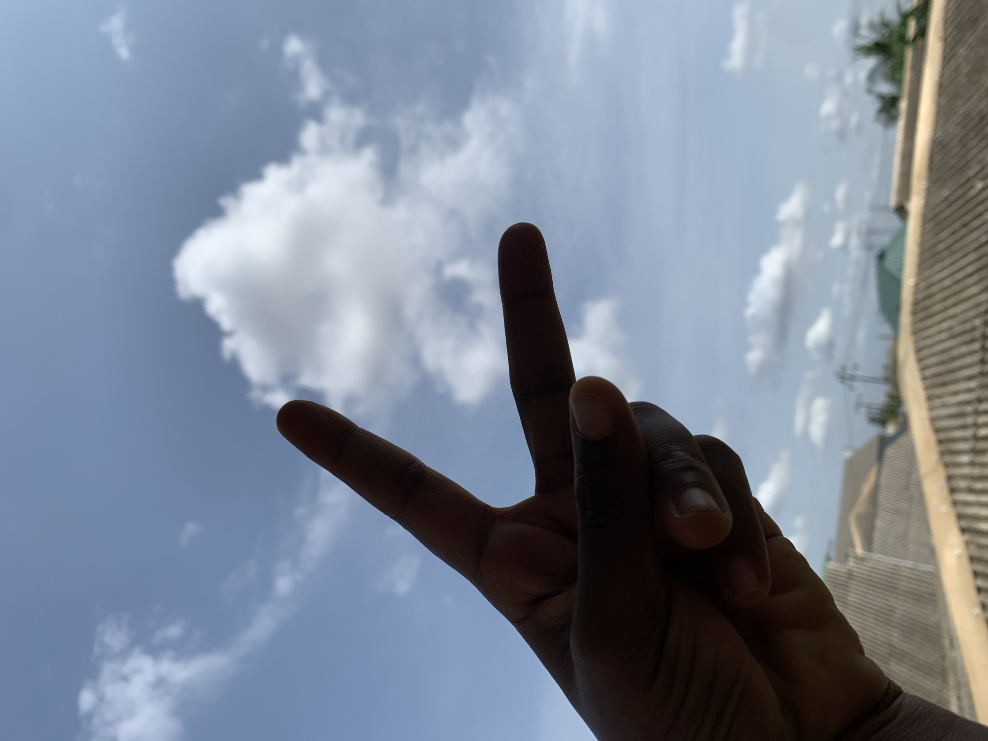 dark-skinned hand making a peace sign against a cloudy blue sky. In the background, there's a glimpse of a building, possibly residential, with stacked levels. The specific location in Ikorodu, Nigeria, cannot be determined from the given image.