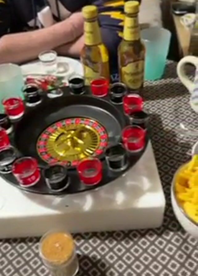 A table is set for a social gathering, possibly a party or game night. The table is covered with a patterned tablecloth and features a roulette drinking game set in the center. The roulette set has a black base with shot glasses arranged around the wheel, some filled with red liquid and some with clear liquid. A man is seated at the table with his arms crossed, wearing a dark blue shirt with yellow sleeves and white accents. Behind the roulette set are two bottles of Perlenbacher beer and plastic cups. Other items on the table include a bowl of potato chips, a small container with brown granules, a glass of a white liquid, and small dishes with clear liquid. The lighting is bright, and the overall atmosphere suggests a casual, convivial setting.