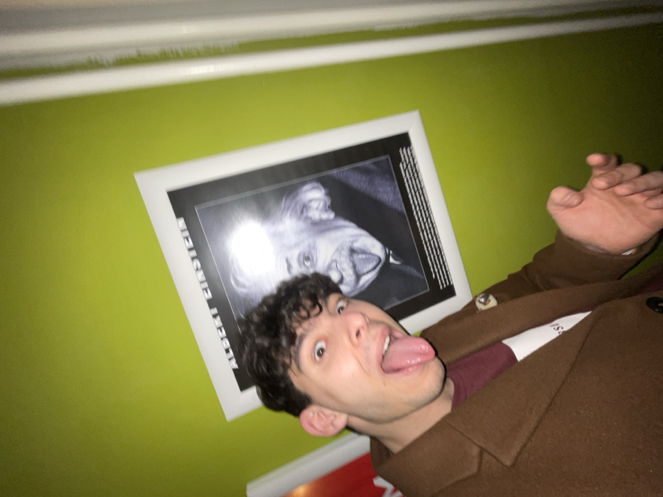 A young adult male, estimated late teens to early twenties, with dark curly hair, is captured in a medium close-up, making a humorous expression by sticking out his tongue and widening his eyes while looking directly at the camera. He is wearing a brown collared coat over a maroon shirt, with a white undershirt partially visible. A small, circular decorative pin is affixed to his right lapel. His left hand is partially visible on the lower right, raised slightly with the palm open towards the viewer. Behind the subject is a bright lime green wall. Prominently displayed on this wall is a framed black-and-white poster of Albert Einstein from his famous tongue-out photograph, with "ALBERT EINSTEIN" printed above the image. The male subject's pose directly mimics Einstein's in the poster. A white vertical architectural element is present along the right edge of the frame, and a partial red object is visible on the far left. This interior scene is located within **One More Bar**, at **ul. "Tsar Shishman" 12, 1000 Sofia Center, Sofia, Bulgaria**.